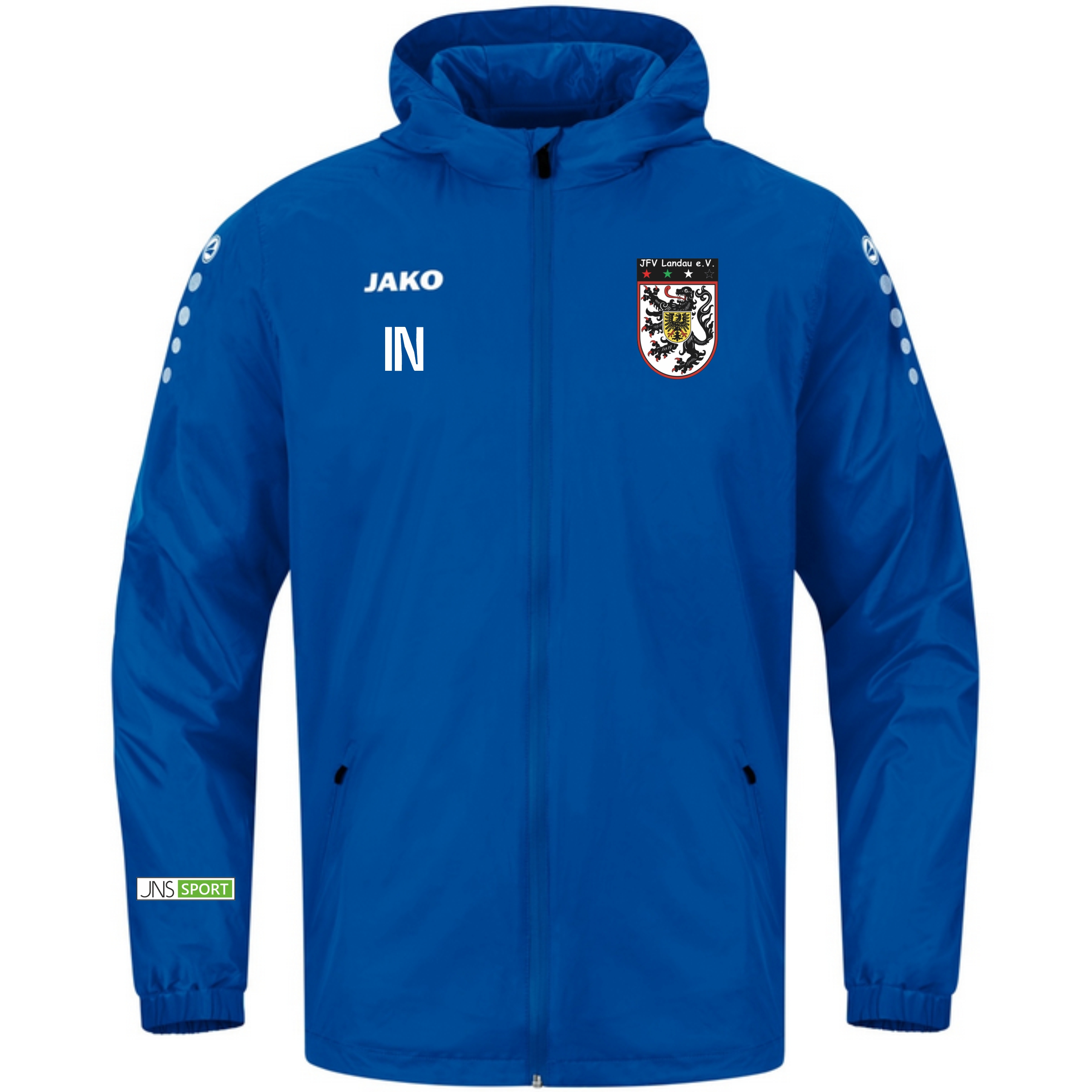 Die JAKO Allwetterjacke Team 2.0 besteht aus 100 % Polyester. Ein hochfunktionelles, wasserabweisendes Obermaterial mit PU-Beschichtung hält dich bei jedem Wetter trocken. Die Kapuze, der verlängerte Rücken und die elastische Binding schützen dich vor Wind und Regen. In den integrierten Seitentaschen mit Reißverschluss kannst Du deine Wertsachen verstauen.